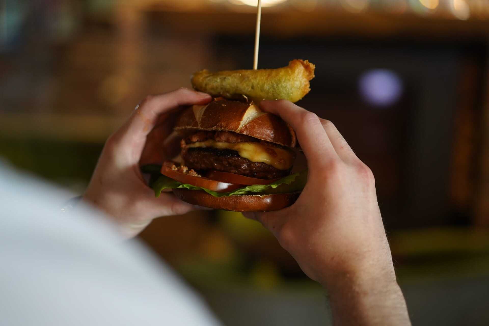 Baby gem, 8oz patty, tomato, taco sauce, beer battered onion ring & skinny fries