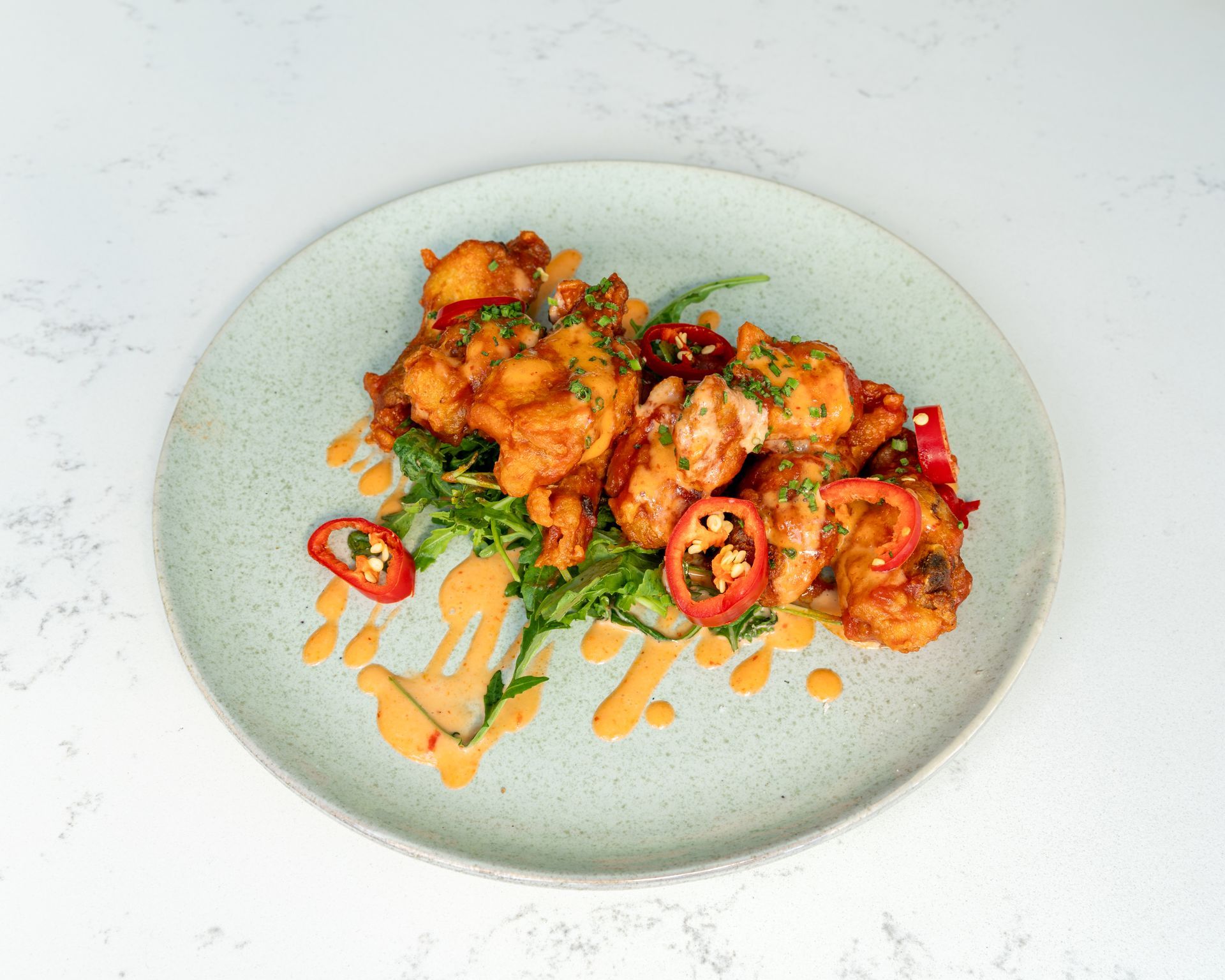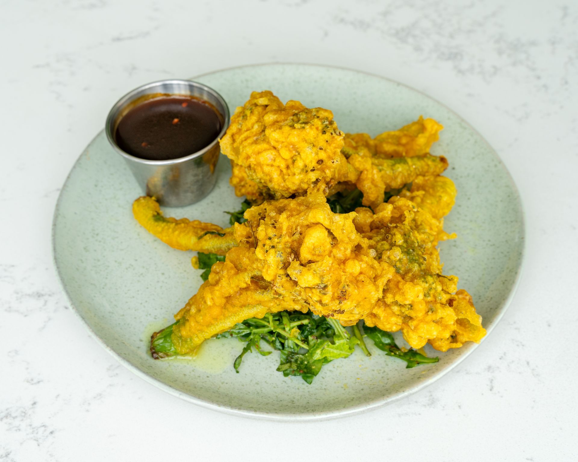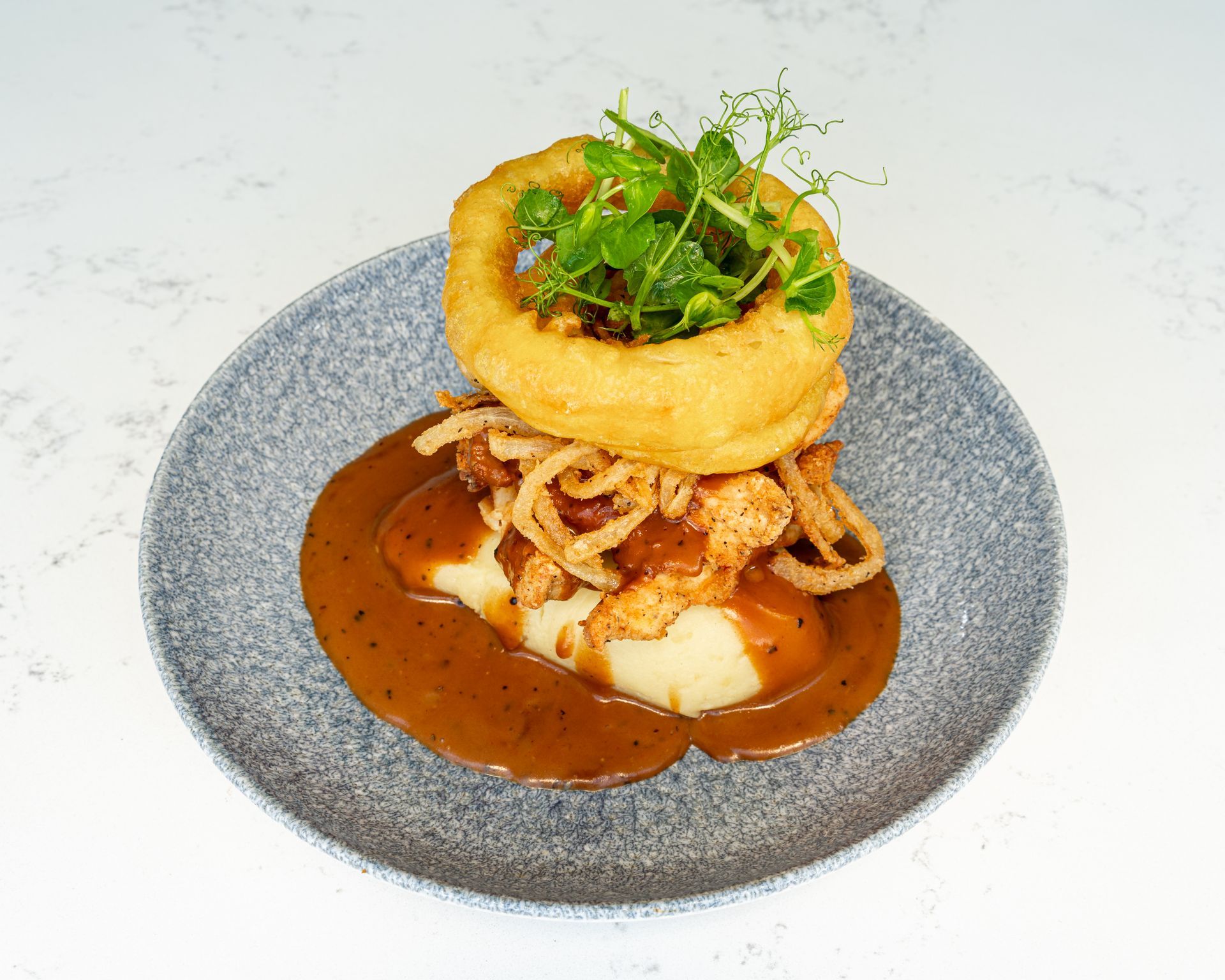 Goujons, tobacco onions, onion rings, pepper sauce, champ