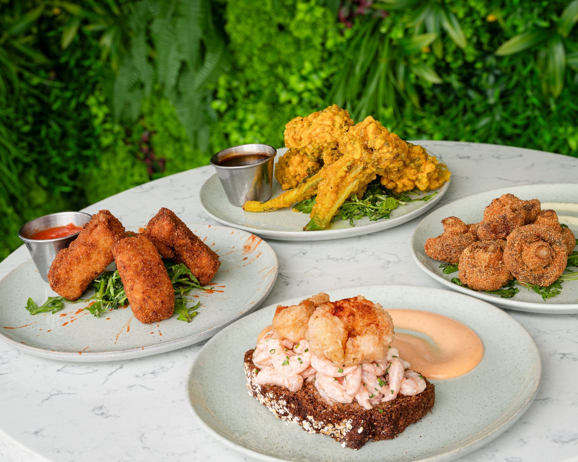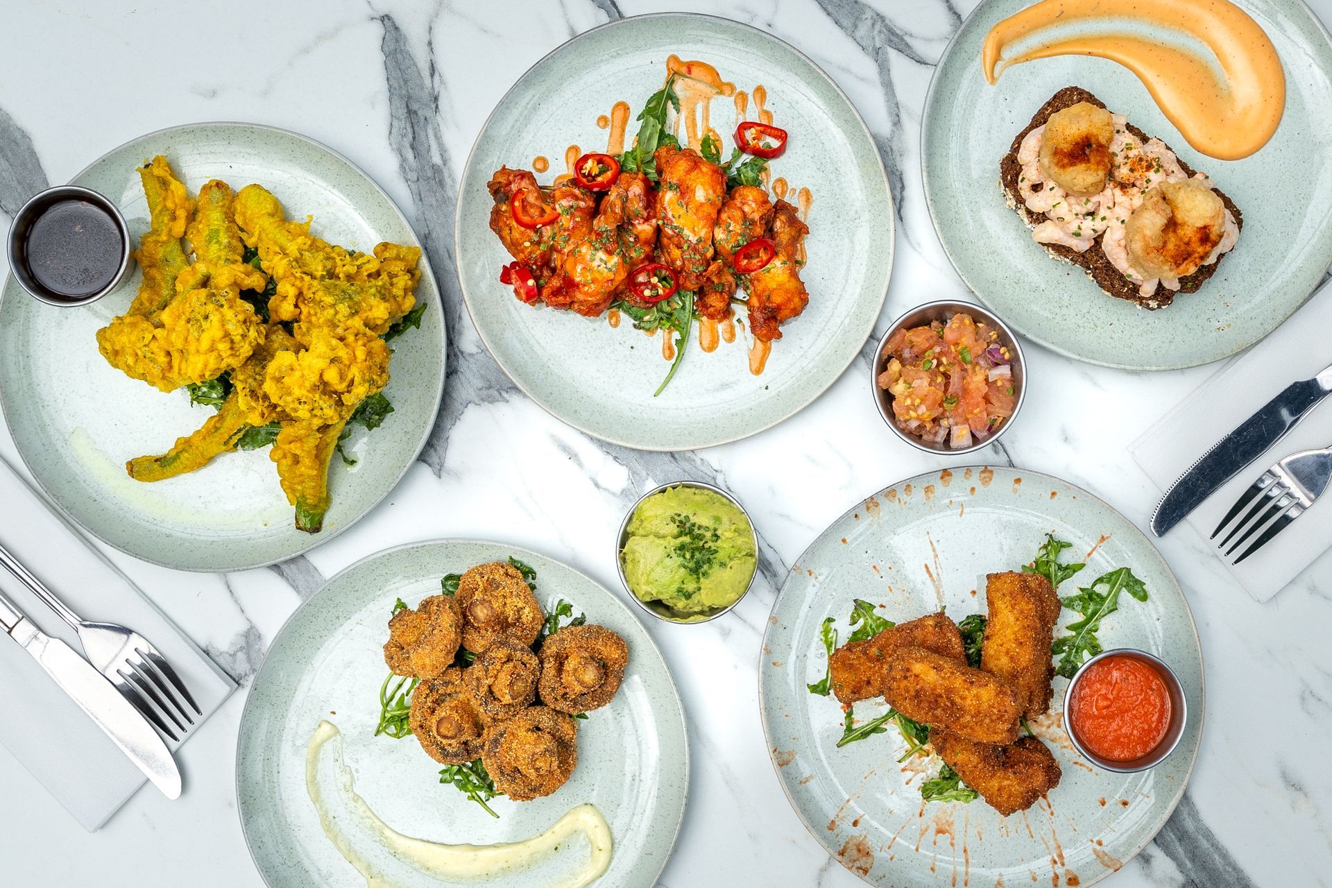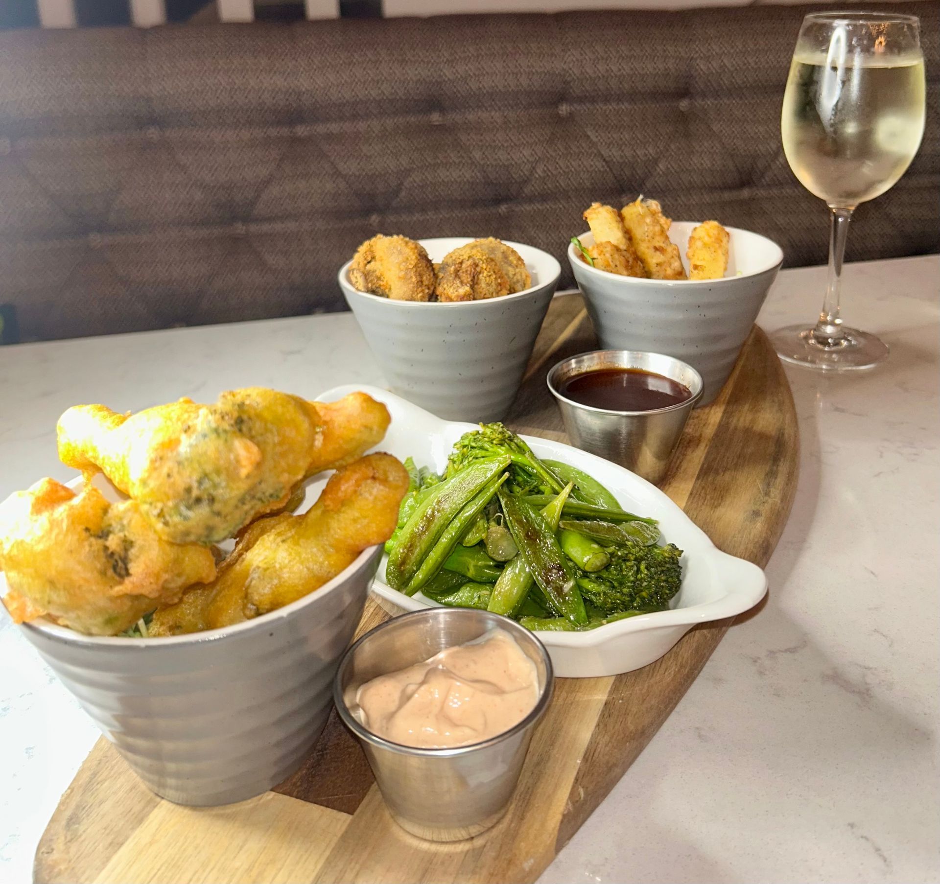 Goujons, tobacco onions, onion rings, pepper sauce, champ