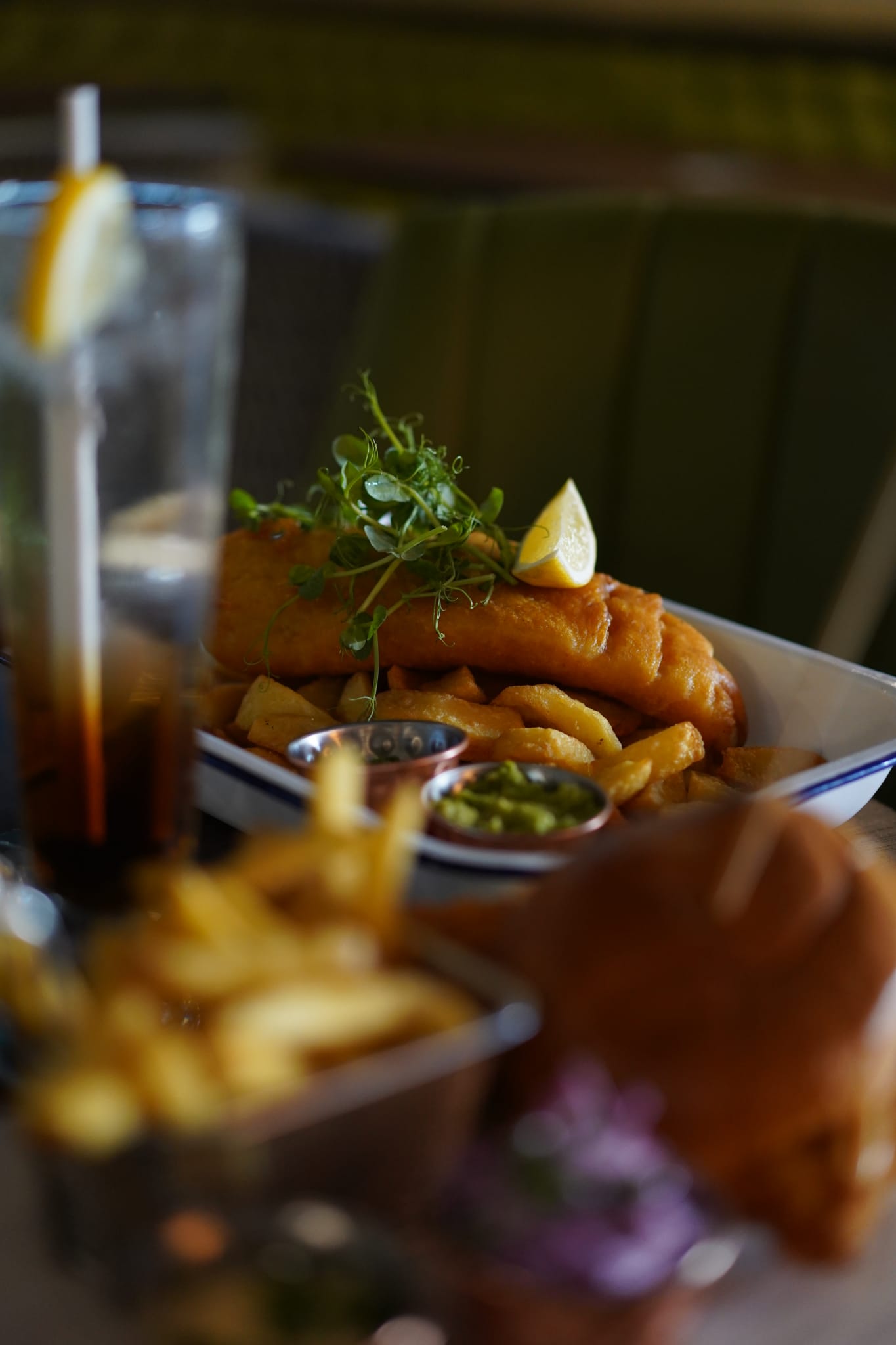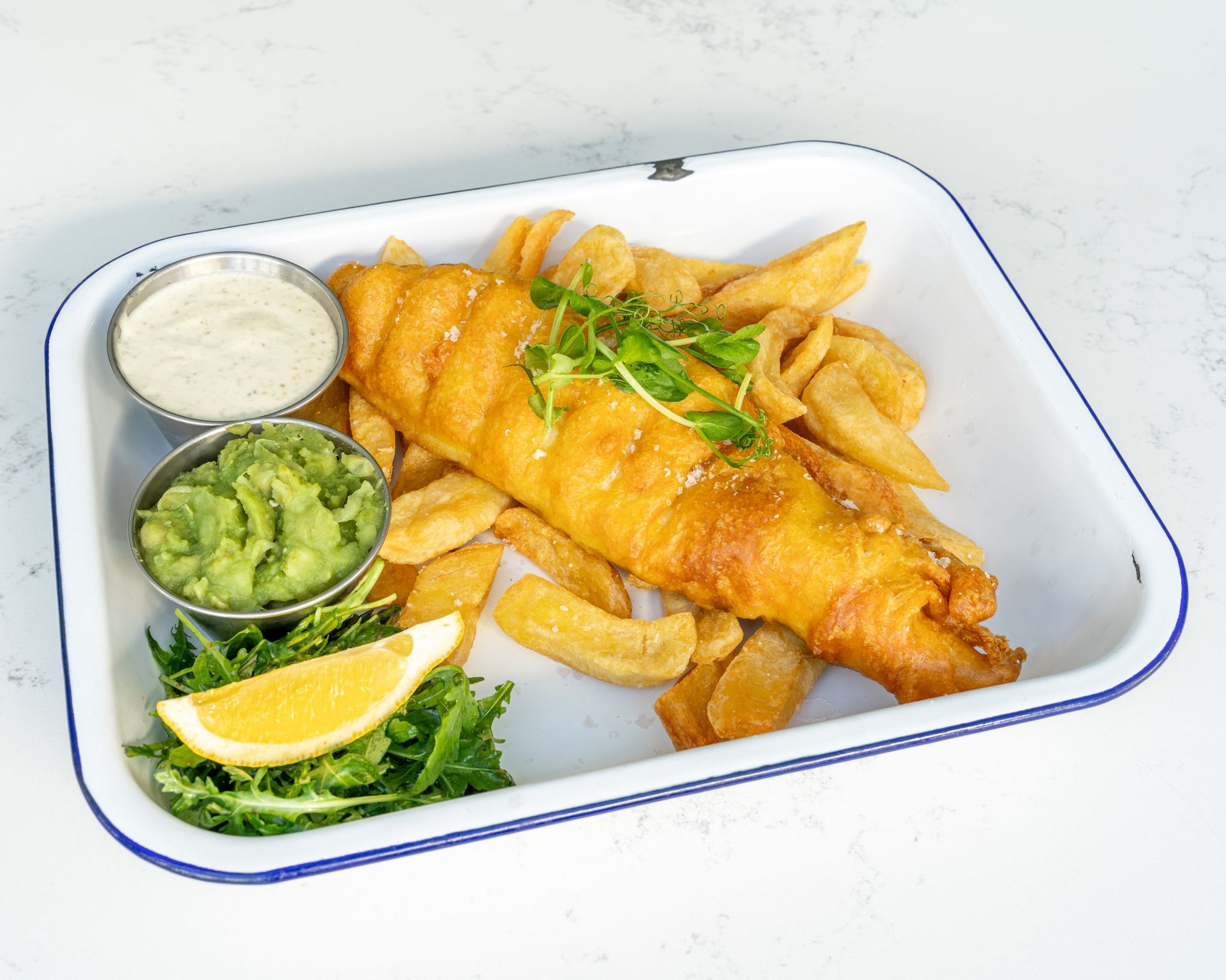 Triple cooked chips, tartar sauce, mushy peas & house salad