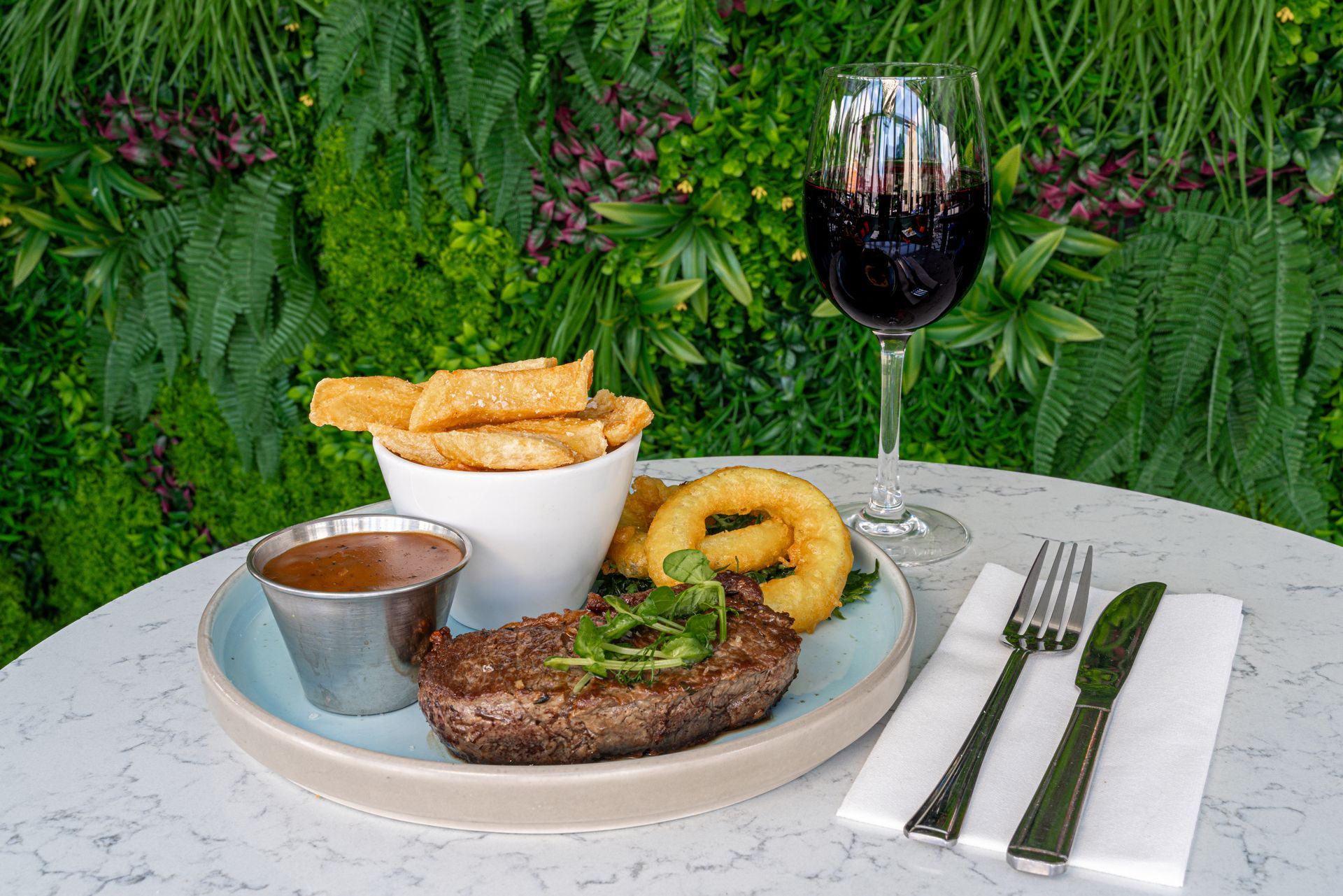 6oz 35-day dry aged sirloin (Stix & Stones), ciabatta, garlic butter, dressed rocket, tobacco onions, peppered sauce & skinny fries